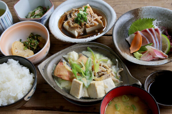 1980円(税込み)メイン小鉢が季節替わりのお刺身定食です。2025年10月~は「鮭のちゃんちゃん焼き」と、「揚げ出汁豆腐の木の子餡かけ」になっています。