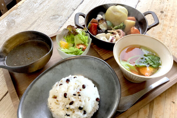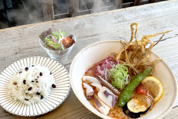 1,860円(税込み)イカ・ノドグロ・アサリの濃厚な旨味に、相性抜群の海賊だしの旨味が絶妙!マイルドなココナッツミルクとレッドカレーのスパイシーな風味が病みつきになるタイ風スープカレーのライスセット(サラダ付き)です。辛味は控えめ、牛豚鶏獣由来の肉・油・エキスを一切使っていない、魚介と野菜の旨味たっぷり!!ライスセットは雑穀米です。
