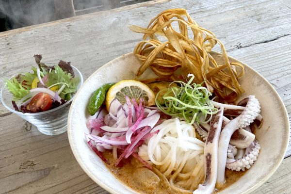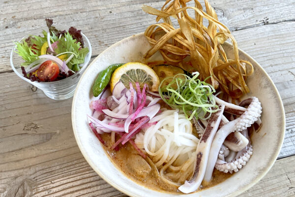 1,860円(税込み)イカ・ノドグロ・アサリの濃厚な旨味に、相性抜群の海賊だしの旨味が絶妙!マイルドなココナッツミルクとレッドカレーのスパイシーな風味が病みつきになるタイ風スープカレーに地元萩産の米粉麺(フォー)で食べる台風カレーラーメン「カオソーイ」です。辛味は控えめ、牛豚鶏獣由来の肉・油・エキスを一切使っていない、魚介と野菜の旨味たっぷり!!フォーとの相性が抜群です!